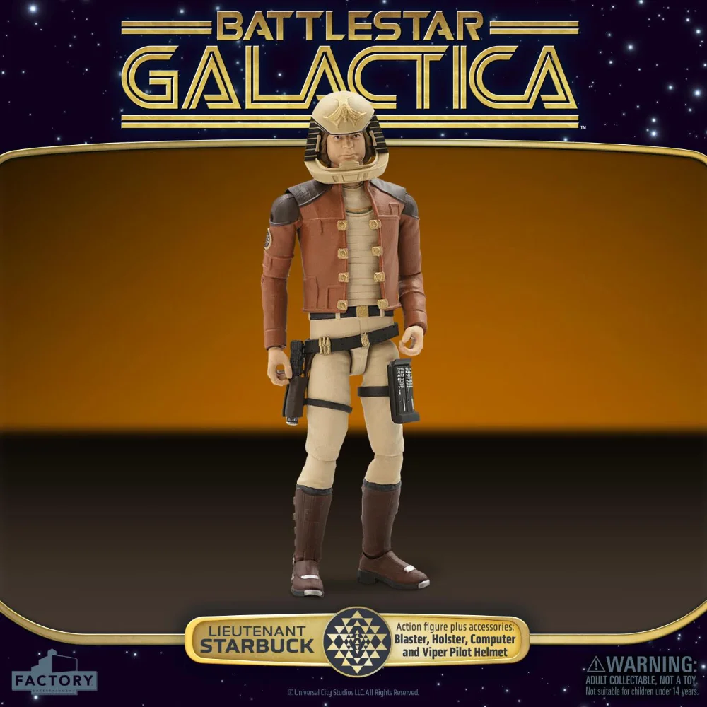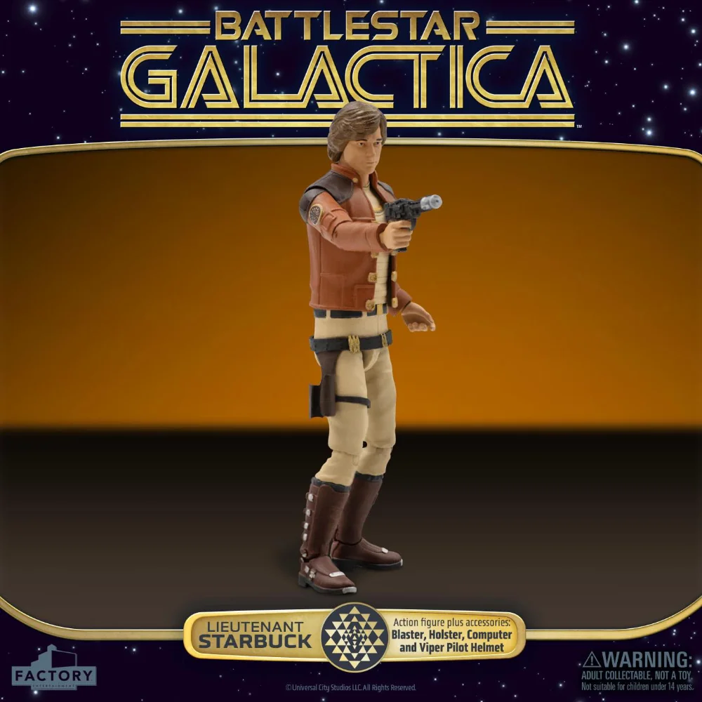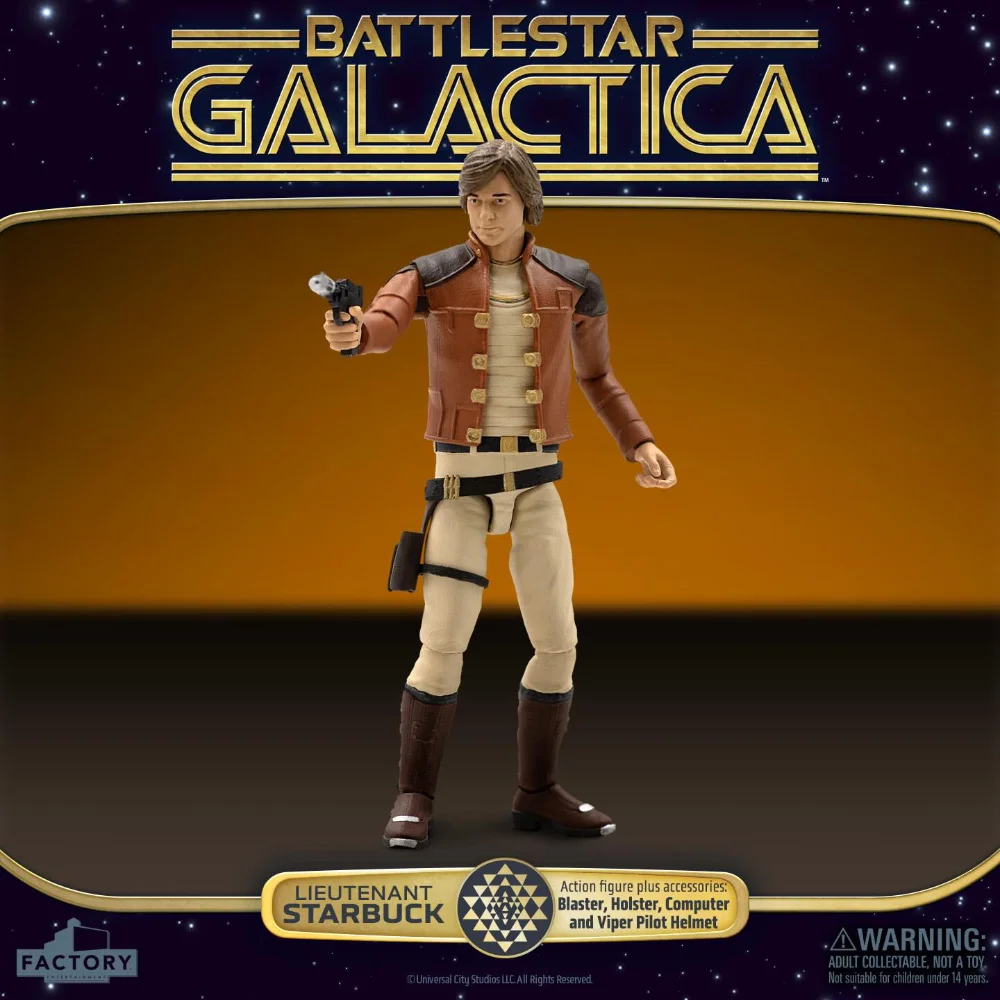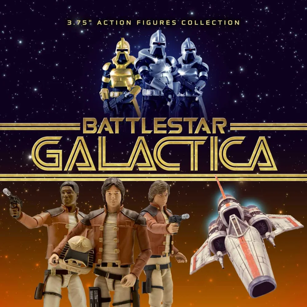 Neben dem Colonial Viper Viper MK 1 erscheint eine neue Serie von 3.75 Zoll Battlestar Galactica Actionfiguren Wave 1, die sich eng an den Designs der klassischen 70er Jahre Serie orientiert. Jede Figur verfügt über dreizehn Bewegungspunkte, was eine gute Balance zwischen Vintage Feeling und moderner Artikulation schafft. Die Kostüme und Accessoires sind detailgetreu und orientieren sich klar am Look der TV Vorlage.