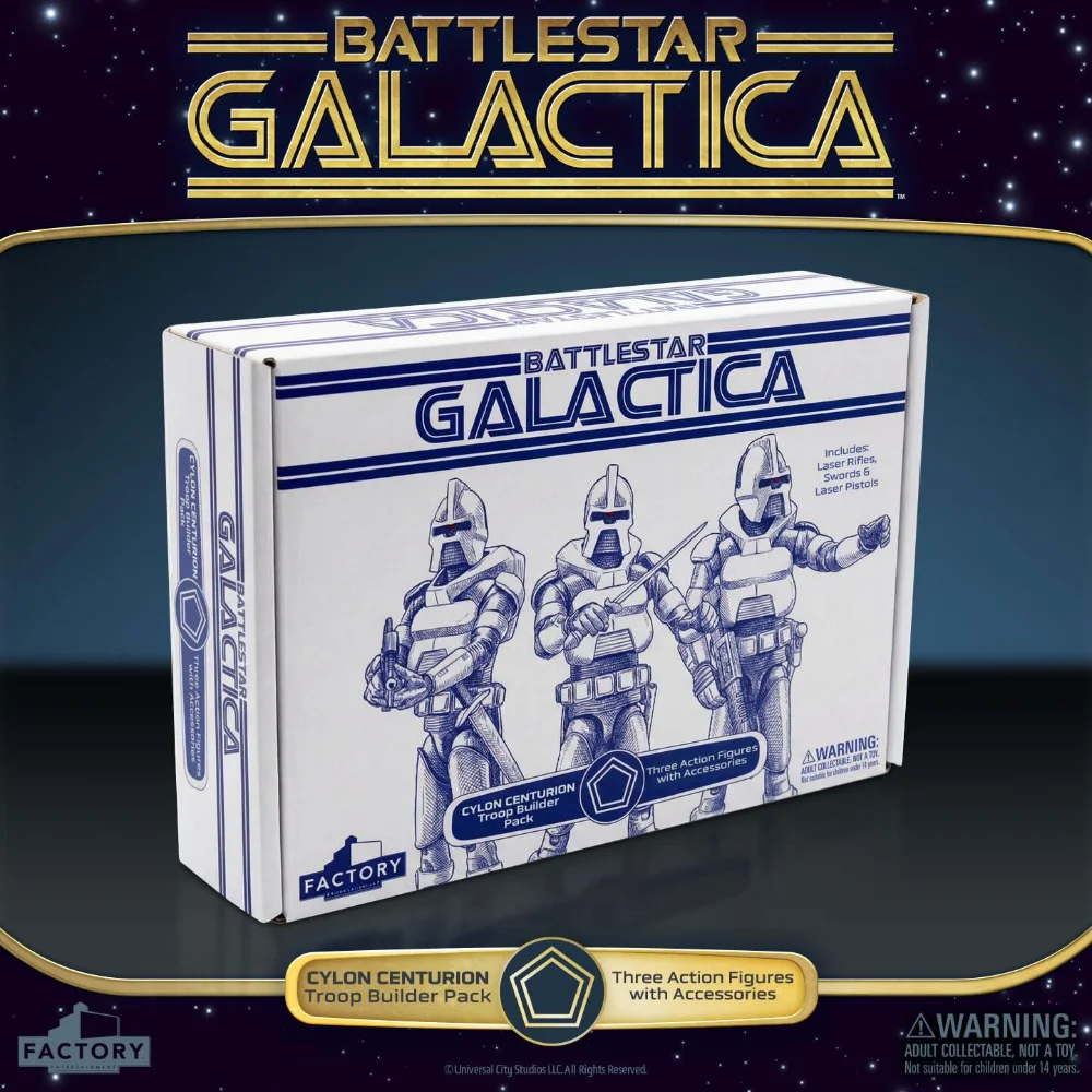 Wer seine Sammlung um eine bedrohliche Armee erweitern möchte, bekommt von Factory Entertainment zusätzlich ein spezielles Troop Builder Pack. Dieses Set enthält drei 3.75 Zoll Cylon Centurion Figuren, jeweils mit dreizehn Bewegungspunkten und ausgestattet mit Schwert, Scheide, Laserpistole und Gewehr. Die drei Cylons sind einzeln polybag-verpackt und gemeinsam in einer Vintage Style Mailer Box untergebracht. Auch dieses Set ist exklusiv über Factoryent.com erhältlich.