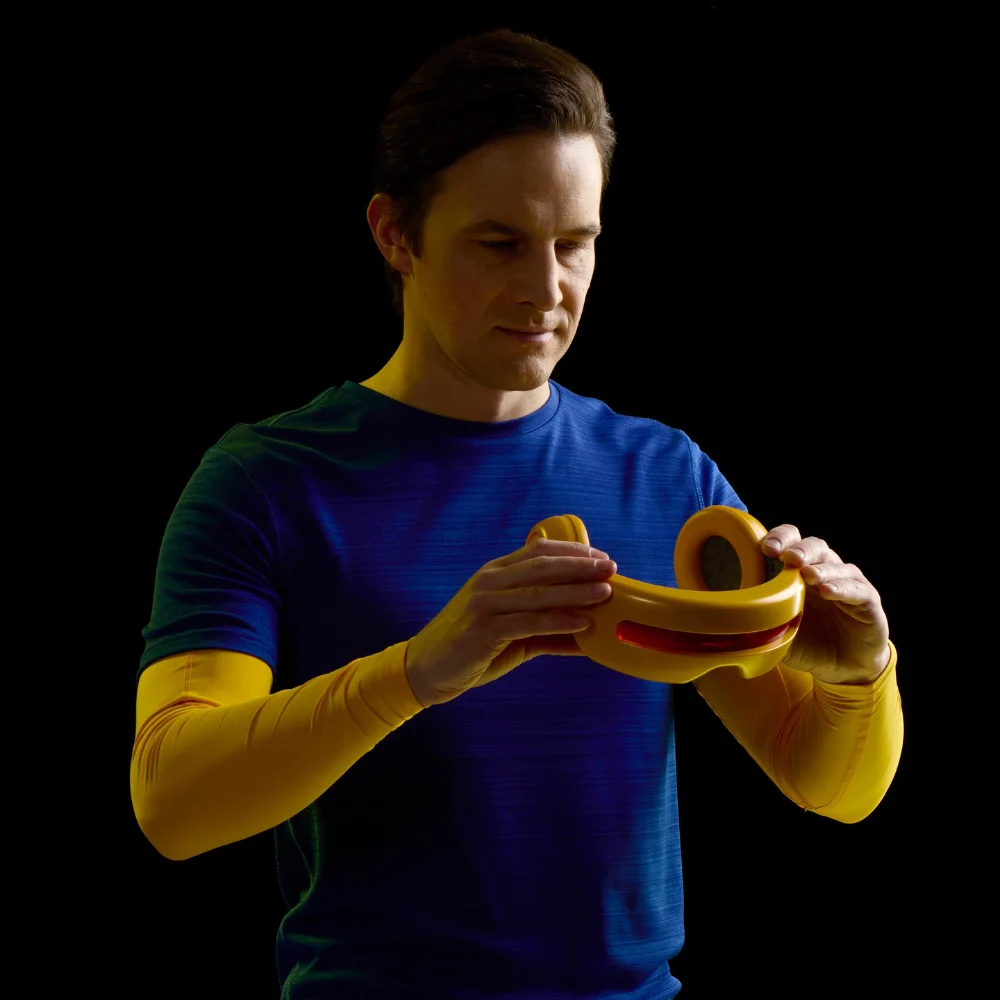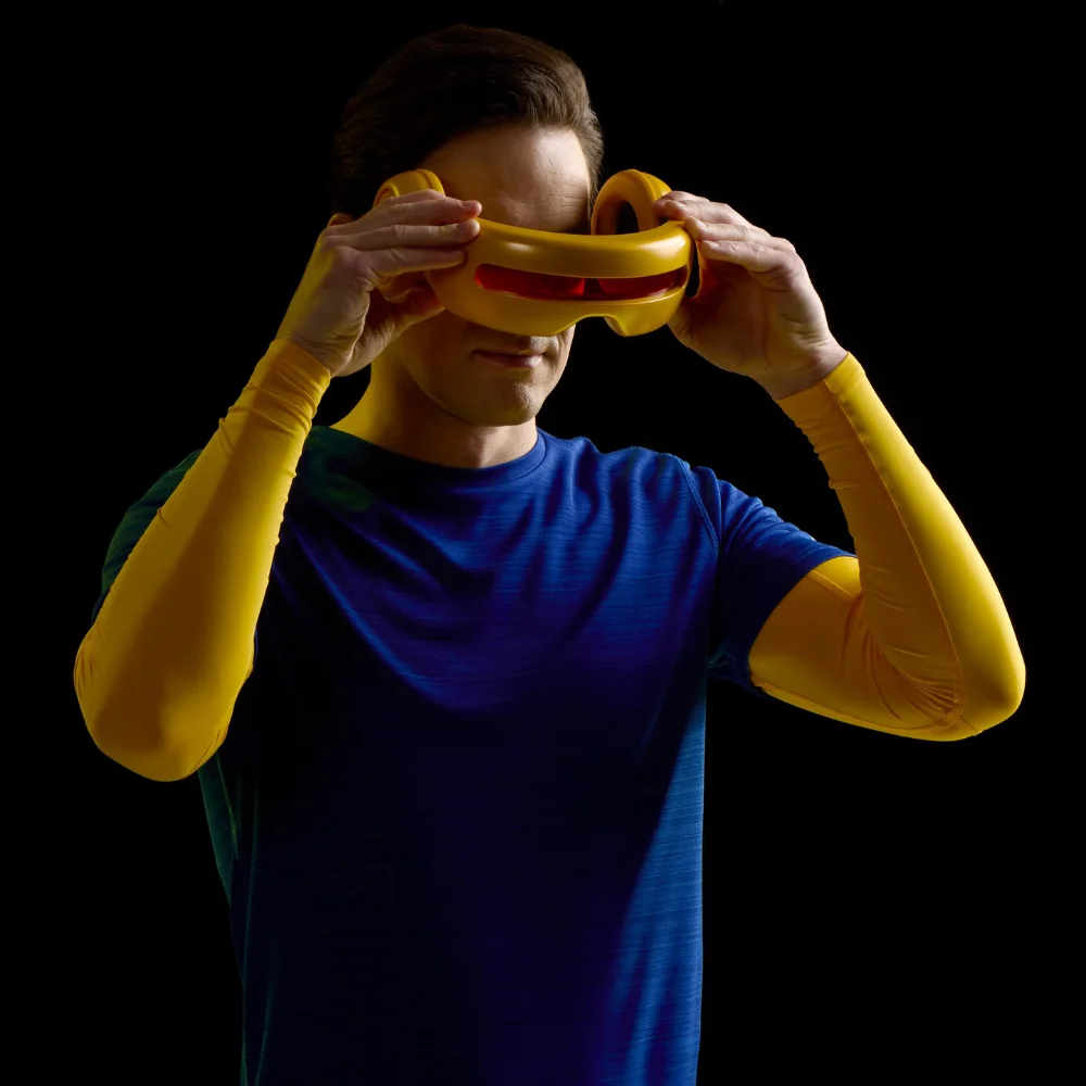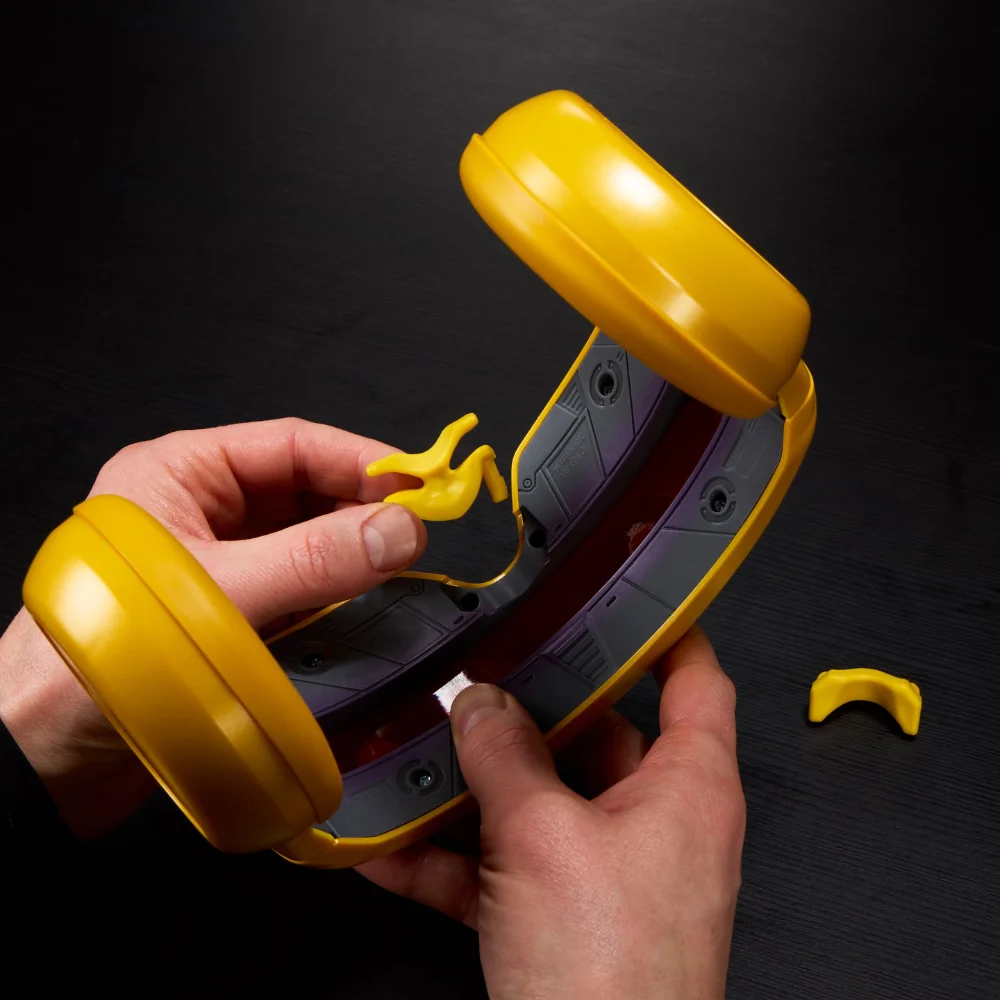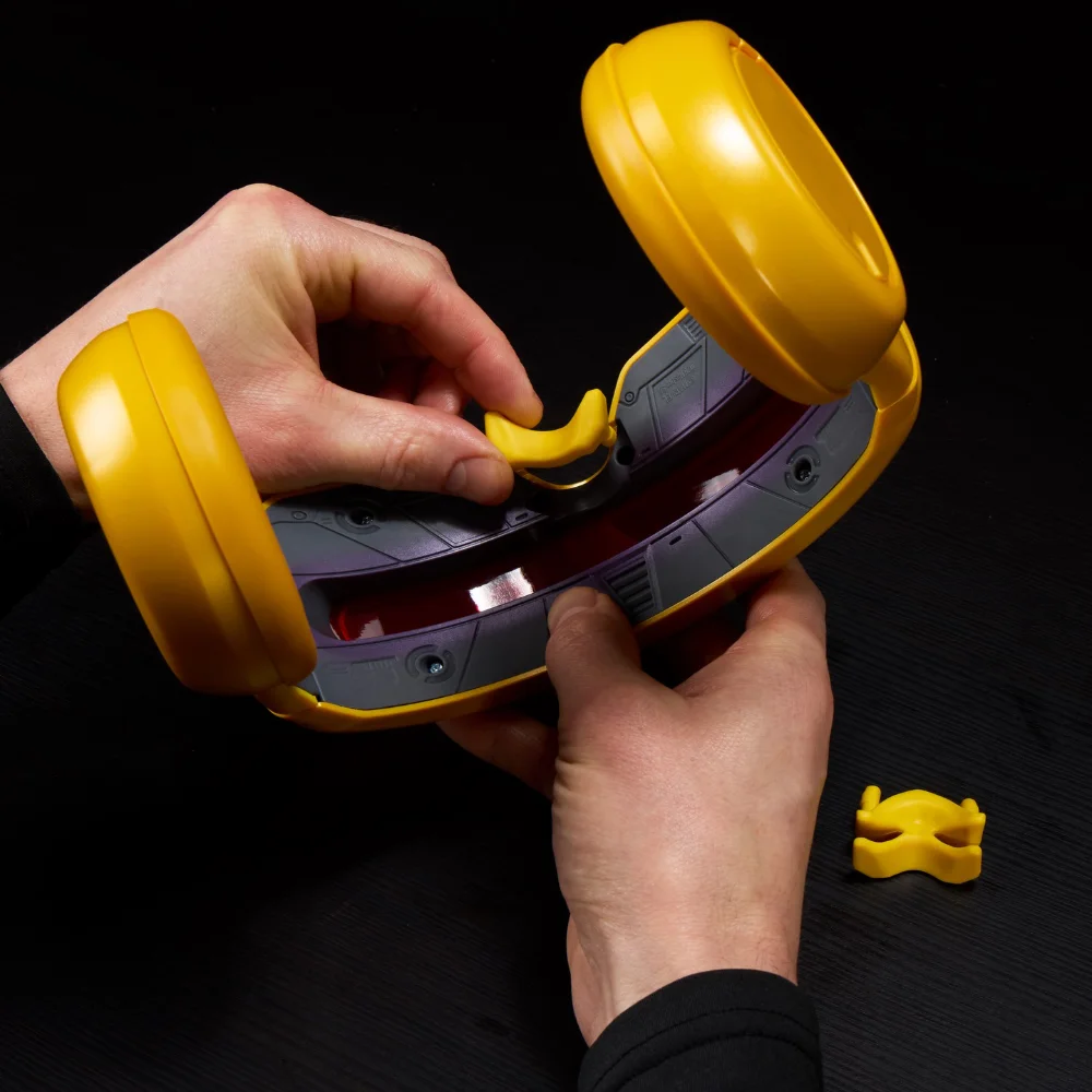 Der Visor setzt auf den bekannten gelb-roten Look und ist nicht nur als Display-Stück gedacht, sondern auch tragbar. Dafür gibt es unter anderem federnde Bügel und austauschbare Nasenteile, damit der Sitz besser angepasst werden kann. Zusätzlich liegt ein Display-Element bei, sodass der Visor auch in der Sammlung vernünftig präsentiert werden kann.