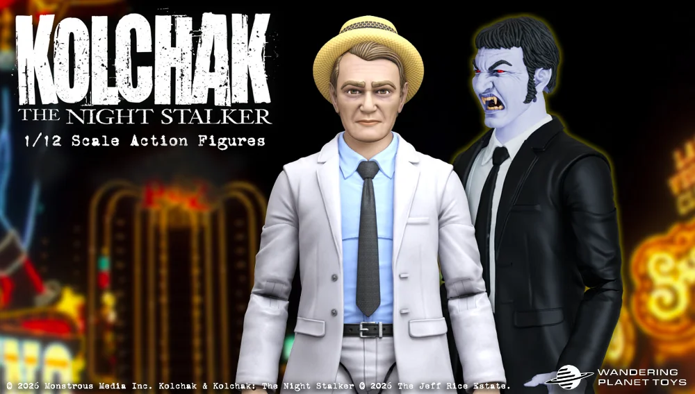 Nach Jahrzehnten ohne eigenes Sammlerprodukt ist es endlich soweit: Kolchak: The Night Stalker erhält seine ersten offiziell lizenzierten Actionfiguren. Verantwortlich dafür sind Wandering Planet Toys in Zusammenarbeit mit Monstrous, die das Projekt aktuell über eine Kickstarter-Kampagne realisieren.