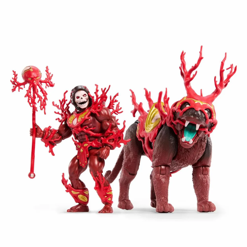 Auf der Gegenseite stehen Skeletor und Panthor, die in dieser Kollaboration eine ganz eigene, extrem intensive Ausstrahlung bekommen. Besonders auffällig ist dabei die Farbwahl. Während He-Man und Battle Cat eher eine noble, fast harmonische Wirkung entfalten, wird Skeletor in kräftige Rottöne getaucht.