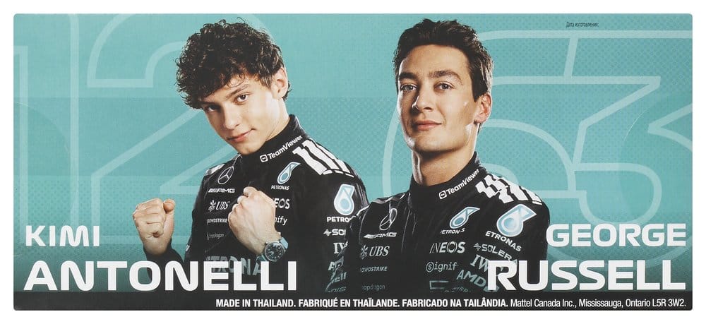 Mit diesem Hot Wheels Premium Mercedes-AMG PETRONAS F1-Team 2er-Pack schaltet jede Hot Wheels Sammlung in den Turbogang. Das Set enthält Die-Cast-Rennautos im Maßstab 1:64, die von den Modellen inspiriert sind, die George Russell und Kimi Antonelli fahren. Jedes Auto verfügt über authentische Lackierungen mit realitätsnahen Frontflügeln und Seitenkästen sowie detaillierten Fahrerhelmen. Die Karosserie und das Fahrwerk aus Metall sowie die Real-Riders-Reifen unterstreichen die hochwertige Verarbeitung der Autos. Mit der speziellen Verpackung und dem individuellen Ausstellungssockel punkten beide Fahrer. Abweichungen in Farbe und Gestaltung vorbehalten.