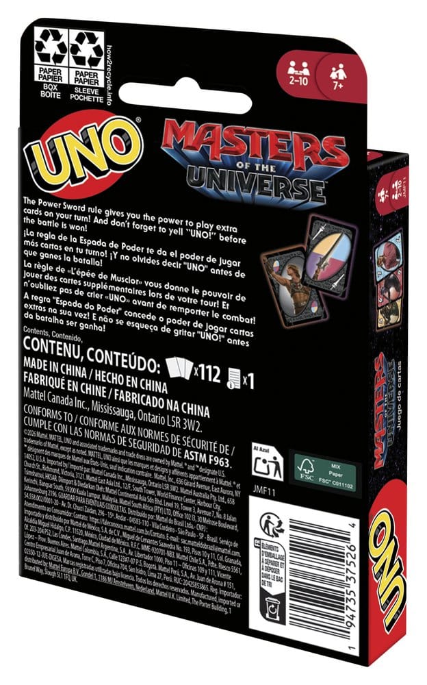 Fans des „Masters of the Universe“-Films werden die Macht spüren, wenn sie diese Sonderedition des Kartenspiels UNO spielen. Das Kartendeck zeigt heldenhafte Bilder von den Lieblingscharakteren aus Eternia. Die Spieler versuchen, passende Zahlen und Farben abzulegen. Es gibt sogar eine Sonderregel „Schwert der Macht“, wodurch die Spieler in ihrem Zug zwei Karten abwerfen dürfen. Und natürlich dürfen die Spieler nicht vergessen, laut „UNO!“ zu rufen, wenn sie nur noch eine Karte auf der Hand haben! Ein legendäres Geschenk für Fans von Masters of the Universe und Kartenspiel-Liebhaber ab 7 Jahren.